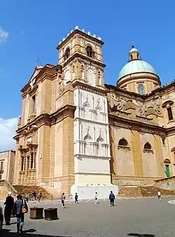 Der Bau, der Anfang des 17. Jahrhunderts errichtet wurde, dominiert mit seiner weithin sichtbaren Kuppel das Stadtbild. Von einem älteren Vorgängerbau ist der 40 Meter hohe Glockenturm im Stil der katalanischen Spätgotik aus dem 15. Jahrhundert erhalten. Das Portal aus dem 18. Jahrhundert zeigt Stilelemente des sizilianischen Barocks.