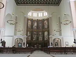 Hinter der weißen Fassade beherbergt die Kathedrale ein Bildnis des Salvator mundi (Jesus, nach der Verklärung, der Schutzpatron von El Salvador), das von Bruder Francisco Silvestre García im Jahre 1777 geformt wurde. Der Hauptaltar zeigt ein Bild von dem Göttlichen Erlöser, das 1546 von Kaiser Karl V. gestiftet wurde. Das Bild ruht auf einem viersäuligen Baldachin, umgeben von Bildern der Propheten Moses und Elias, die an der Verklärungsgeschichte teilnehmen. Der Hauptaltar ist von acht großen Gemälden umgeben, die Szenen aus dem Leben Christi zeigen, die von Andrés García Ibáñez gemalt wurden. Über allem steht die churriguereske Kuppel mit einer Höhe von 45 Metern und einem Durchmesser von 24 Metern.[3]