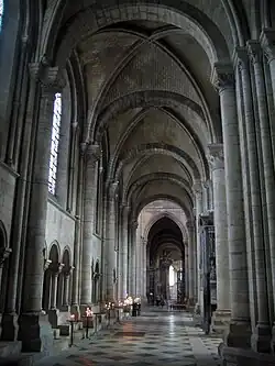 Mit dem Stützenwechsel verbunden ist eine spezielle Art, wie sich das Langhaus der Kirche aus einzelnen Abteilungen zusammensetzt. Da gibt es in der damaligen Architektur Unterschiede. Es gibt romanische Kirchen, deren Mittelschiff ist mit einer einzigen sogenannten Tonne gewölbt, einer rund gebogenen Fläche ohne Unterteilungen. Hier in der Frühgotik wird es eine Entwicklung von einem sechsteiligen Gewölbe – wie hier in Sens – zu einem vierteiligen geben. Und das hat damit zu tun, dass sich die Rhythmisierung des Raumes ändert. In der Hochgotik wird es keinen Stützenwechsel mehr geben, sondern nur noch einheitliche Formen – und die zugehörigen Gewölbe werden damit vierteilig, der Rhythmus wird schneller (Kathedrale von Chartres).