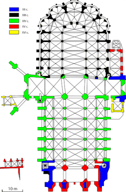 Das Mittelschiff des Langhauses ist deutlich schmaler als der Hochchor, was in Vierung und Querhaus mehrere schiefe Winkel bewirkt. Mehrere Mittelschiffsjoche sind in Längsrichtung durch eine in Längsrichtung geführte Scheitelrippe miteinander verbunden, was sie optisch einer Spitztonne annähert. Zwischen den Fensterlaibungen und den Bündelpfeilern gibt es schmale Wandstreifen.