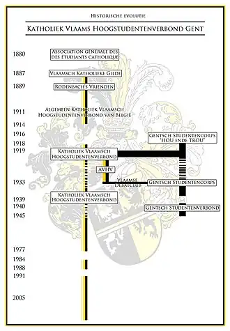 Die erste Organisation katholisch-flämischer Studenten an der damals französischsprachigen Universität Gent war die Vlaamsch Katholieke Gilde (Flämische Katholische Gilde), gegründet im Jahr 1887 durch Lodewijck de Bock. Ziel dieses Vereins war die Vereinigung flämisch orientierter (Flamingante) und katholischer Studenten gegen die flämische, aber sehr freisinnig-liberale akademische Sozietät T Zal Wel Gaan einerseits, und die katholische, aber französischsprachige Gesellschaft Association Générale des Étudiants Catholique andererseits. Im Jahr 1889 änderte man den Namen auf Rodenbach’s Vrienden, eine Reverenz an Albrecht Rodenbach, der zehn Jahre zuvor die Fundamente der flämischen Studentenbewegung mit seinem Aufruf zur Gründung einer Studentenbewegung ähnlich der mächtigen und triumphierenden Burschenschaft, einer flämischen Burschenschaft oder Knapenschap gelegt hatte.[1][2]