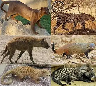 Katzenartige: Oben: Fossa und Leopard, Mitte: Tüpfelhyäne und Halsstreifenmanguste, unten: Pardelroller und Afrikanische Zibetkatze | ||||||||||||