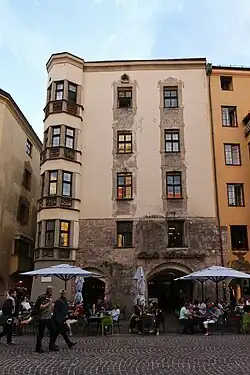 Das fünfgeschoßige Eckhaus über rechteckigem Grundriss stammt im Kern aus der 1. Hälfte des 16. Jahrhunderts. Es weist Lauben und zwei Fensterachsen an der Herzog-Friedrich-Straße und zwölf Fensterachsen an der Seilergasse auf. An der Ecke befindet sich ein über die ganze Höhe reichender turmartig vorgezogener Erker. Die figürlichen Reliefs am Erker stammen von Gregor Türing, der mit seinem Vater auch an den Wappenreliefs des Goldenen Dachl gearbeitet hat. Die Reliefs entstanden um 1530, wurden jedoch im Zuge der neugotischen Umgestaltung der Fassade im Jahre 1862 durch Zementabgüsse ersetzt. Den Original-Reliefs am nächsten kommen die vier Turnierszenen und die vier Spielleute (zwei mit bäuerlichen Trompeten- und Holzbläsern mit einem tanzenden Brautpaar, das dritte mit Musikanten mit Geige, Klarinette und Laute, das vierte mit zwei Landsknechten mit Schwegel und Trommel). Die Szenen erinnern an die damalige Funktion des Stadtplatzes als Austragungsort ritterlicher Kampfspiele und Aufführungen.