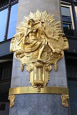 Bemerkenswert ist die große Anzahl vergoldeter Fassadenelemente – dieser reiche Goldschmuck ist für ein Geschäftshaus in Mitteldeutschland einmalig. Es besteht aus drei nahezu gleich großen vertikalisierten Fassadensegmenten. Das mittlere, welches als verbrochene Ecke errichtet wurde, dient als Schaufassade. An dieser befindet sich der von zwei großen Allegorien flankierte Eingang zum Gebäude. Die Allegorien stellen die zwei „weiblichen“ Todsünden Eitelkeit (Superbia) und Luxuria (Genusssucht) dar. Gekrönt wird die Schaufassade von einem großen Giebel mit vergoldeten Voluten. Seitlich befinden sich zwei gedrungene Ecktürmchen, die eine Verbindung zu den Seitenfassaden herstellen. Auf dem Giebel sitzt ein Turmerker, dessen oberen Abschluss eine reich gegliederte ebenfalls vergoldete Turmkrone bildet. An diesem Gebäudeteil wird deutlich, dass es sich nicht um ein reines Jugendstilbauwerk handelt, sondern auch Elemente des Neobarock verwendet wurden. Unterhalb des Turmfensters befindet sich eine gusseiserne Schrift mit dem Namen des Kaufmanns und Bauherrn Franz Ebert (1858–1922). Das Dach bestimmen geschmückte Gauben und im Mittelteil zwei Obelisken.
