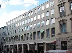 Wiedemann schuf in Stahlbetonskelettbauweise einen schlichten fünfgeschossigen kubischen Bau mit verputzter Lochfassade. Die Fassade wird durch gleichmäßig angeordnete Fensterreihen gegliedert. Im Erdgeschoss erschließt eine weiträumige Arkade den Zugang zum Gebäude und den Auslagen.