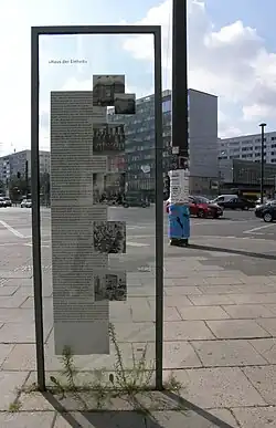 Auf dem Bürgersteig vor dem Eingang dokumentieren Fotos und viersprachige Kurztexte auf einer von Rainer Eppelmann am 5. Juni 2008 enthüllten gläsernen Stele die Geschichte des Gebäudes. Unter dem Titel Haus der Einheit ist sie Teil eines Gesamtprojekts des Senats zur Sichtbarmachung von Berliner Geschichtsorten.
