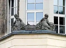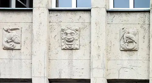 Das vierstöckige Gebäude mit ausgebautem (fünften) Dachgeschoss hat eine zur Straßenseite hin gestaltete Fassade: in der ersten Etage schmücken Putten und zwischen zweiter und dritter Etage plastische Sandsteinplatten im Jugendstil die Front (siehe Bilder).