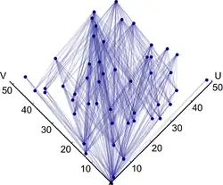 Eine Kausalmenge (englisch causal set oder kurz causet[1])[2][3] ist definiert als eine lokal endliche (finite) Halbordnung (englisch locally finite poset). Eine Kausalmenge ist damit eine Menge versehen mit einem speziellen Typ einer Teilordnungsrelation bzw. . Diese Teilordnungsrelation ist durch das spezielle Axiom der lokalen Endlichkeit (Finitheit) gekennzeichnet. Dieses Axiom fordert, dass sich zwischen zwei beliebigen Elementen gemäß der Teilordnungsrelation höchstens endlich viele andere Elemente befinden dürfen. Da es für die Trägermenge als Ganzes keine Einschränkungen bezüglich ihrer Mächtigkeit (Mathematik) gibt, verhält sich eine Kausalmenge nur lokal diskret.