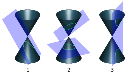 • Enthält die Schnittebene die Kegelspitze nicht, entstehen die nicht ausgearteten Kegelschnitte (s. Bild zu Ib, IIb), nämlich eine Parabel, eine Ellipse oder eine Hyperbel, je nachdem, ob die Kegelachse von der Schnittebene unter dem gleichen, einem größeren oder einem kleineren Winkel geschnitten wird als von den Mantellinien des Kegels.