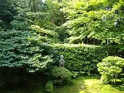 - Der Shii-Garten (思惟の庭; C) – Garten der Gedanken – befindet sich östlich der Abtsresidenz. Dort stehen 16 Arhat-Steine auf zwei künstlichen Erhebungen. Der grundlegende Stein in der Mitte ist als Meditationsstein des Zen gedacht. Zusammengesehen macht der Garten den Eindruck eines Märchenlandes.