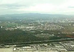 Erhebliche Gemarkungsflächen gingen bei Gründung der Gemeinde Zeppelinheim 1938 verloren. Kelsterbach erhielt 1952 das Stadtrecht.[16] Durch die Mitgliedschaft im 1975 gegründeten Umlandverband Frankfurt konnte die erwogene Eingliederung in die Stadt Frankfurt zwar abgewendet werden, aber 1977 musste im Rahmen der Gebietsreform in Hessen durch die zunehmende Ausdehnung des südlich angrenzenden Frankfurter Flughafens weitere Gemarkungsfläche abgegeben werden[17]: Der 733 Hektar große Anteil Kelsterbachs am Flughafengelände fiel an die Stadt Frankfurt.[18] Da damit eine wichtige finanzielle Quelle verloren zu gehen drohte, wurde eine „Vorteilsausgleichszahlung“ vereinbart.[19] Die Ausdehnung des Flughafengeländes setzte sich mit dem Bau der Landebahn Nordwest 2011 fort und stellt die kommunale Selbstständigkeit wieder zunehmend in Frage.