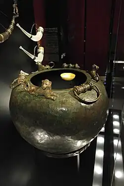 Der Met war in einem großen Bronzekessel angesetzt worden, der dem Grabherrn bereits zu Lebzeiten gedient hatte: ein sehr repräsentatives Objekt, das aus dem griechischen Kulturkreis stammte, dort allerdings zur Aufnahme von Wein bestimmt war. Der rundbodige Kessel fasst etwa 500 Liter. Er hat einen Durchmesser von 104 cm bei einer Höhe von 80 cm. Am oberen Rand sind im Wechsel drei Löwenfiguren und drei Henkel angebracht.[1] Der Kontakt mit Kupfersalzen im Kessel ermöglichte den Nachweis, dass der Kessel mit Met gefüllt war, während sonst Met unter mitteleuropäischen Klimabedingungen selten nachweisbar ist.[2]