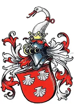 Blasonierung: In Rot drei (2:1) silberne Muscheln. Auf dem gekrönten Helm ein silberner Schwanenhals mit rotem Schnabel und Halsband. Die Helmdecken sind rot-silbern.[3]