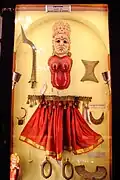 Verschiedene Artefakte, in der Mitte die Göttin Durga, reitend auf einem Tiger -