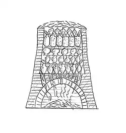 Der nächste technologische Fortschritt war das Einführen einer Lochtenne, die den Feuerraum von der Brennkammer trennt. Dadurch wird verhindert, dass rauchige Flammen und carbonisiertes Brennmaterial mit der Keramik in Kontakt kommen und Flecken und Schmauchung verursachen.[32] Die zu brennenden Gefäße wurden im oberen Teil aufgestapelt, mit der Öffnung nach unten. Die heißen Gase stiegen an den Gefäßen vorbei auf und zirkulierten in ihnen, und dadurch wurde der Ton gebrannt.[33] Solche Schachtöfen mit Lochtenne sind seit dem Alten Reich durch bildliche Darstellungen und archäologische Funde belegt.