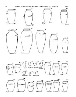 - ↑ Die Wavy-Handled-Keramik tritt ab der Naqada-IIc-Zeit in Erscheinung. In der Beschaffenheit und Bearbeitung ist sie identisch mit der Decorated-Ware. Die Oberflächenfarbe reicht von Hellrot bis Gelblich-Grau. Charakteristisch ist der Wellenhenkel.