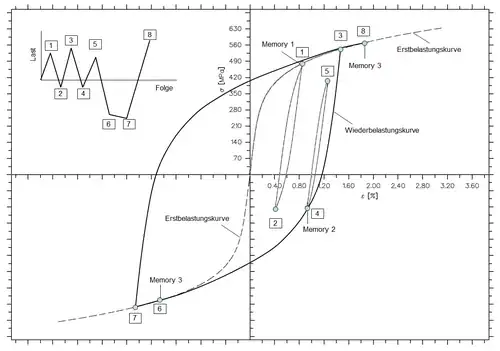 - Memory 2: Nach Schließen einer Hystereseschleife, die auf einem Schleifenast begonnen wurde (Pfad 4-5-4), folgt der Spannungs-Dehnungs-Pfad dem ursprünglichen Schleifenast (Pfad 3-4-6).