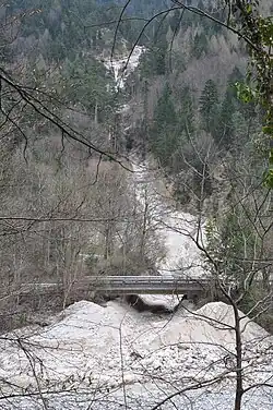 Mündung in die Saalach mit Resten der Mure. Der oberste sandige Teil im Bild war bewaldet und wurde durch die Mure weggerissen. | ||