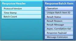 Im Header wird zwischen zwei Nachrichtentypen unterschieden: Request und Response. In beiden Headern ist jeweils die Protokoll-Version und der Batch Count angegeben. Der Batch Count gibt an, wie viele Operationen mit dieser Nachricht angefordert werden. Dazu kommen weitere Daten, abhängig vom Typ. Ein Batch-Objekt spezifiziert die gewünschte Operation und beinhaltet alle dafür benötigten Attribute. Die gepunkteten Attribute in den folgenden Abbildungen sind optional.
