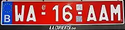 Ausländer oder Belgier, die sich nur vorübergehend in Belgien aufhalten und ein Kraftfahrzeug benutzen, das keine ausländischen Kennzeichen hat, bekommen ein vorläufiges Kennzeichen oder ein Transitkennzeichen, dessen Hintergrund rot (RAL 3020) ist. Die Schrift und der Rand sind weiß. Nach dem EU-Symbol folgen seit dem 2. Mai 2016 ein Buchstabenpaar, das mit einem W beginnt, ein Ziffernpaar, das das Jahr der Gültigkeit angibt, und drei Buchstaben.