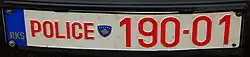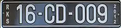 Die Kfz-Kennzeichen des Kosovo wurden am 6. Dezember 2010[1] eingeführt und sind in der Regel weiß mit schwarzer Aufschrift. Die Schilder enthalten in Anlehnung an die Euro-Kennzeichen einen blauen Streifen am linken Rand mit den Buchstaben RKS (für Republik Kosovo). Eine zweistellige Zahl gibt im Folgenden die entsprechende Region an, bevor das kosovarische Wappen auf dem Schild erscheint. Es folgen drei Ziffern und – von einem Strich getrennt – zwei Buchstaben als fortlaufende Seriennummer.[2]