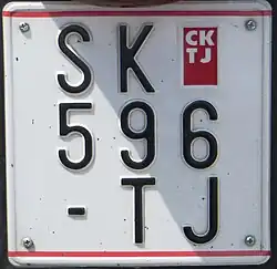 Die für Zweiräder verwendeten Kennzeichen besitzen drei Zeilen. In der obersten erscheint das Regionskürzel, in der mittleren vier Ziffern und unten die beiden weiteren Buchstaben.