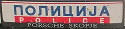 Polizeifahrzeuge zeigen auf dem vorderen Schild die blaue Aufschrift ПОЛИЦИЈА (Policija). Am unteren Rand wird die englische Bezeichnung POLICE in weiß auf rot gezeigt. Die hinteren Schilder zeigen zwei blaue Zahlenblöcke aus je drei Ziffern getrennt durch das Emblem der mazedonischen Polizei.