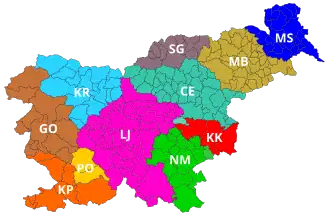 Dieses System wurde noch aus jugoslawischer Zeit übernommen, wobei diese (ursprünglich sogar noch aus der altösterreichischen Zeit stammenden) Bezirke seit der Unabhängigkeit Sloweniens aus verwaltungstechnischer Sicht eigentlich nicht mehr existieren und nur mehr auf den Kfz-Kennzeichen und bei der regionalen Kommandostruktur der slowenischen Polizei weiterleben.