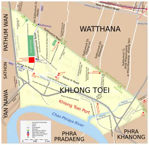 Khlong Toei liegt im südlichen Stadtbereich und umfasst unter anderem einen Teil der Sukhumvit Road. In Khlong Toei befindet sich der Hafen von Bangkok. Der Bezirk ist außerdem bekannt für das größte Slumgebiet Bangkoks. Der Nordwesten des Bezirks erfüllt dagegen Funktionen eines zentralen Geschäftsviertels Bangkoks. Hier sitzen die thailändische Börse, das Königin-Sirikit-Kongresszentrum, Banken, Hotels und Einkaufszentren.