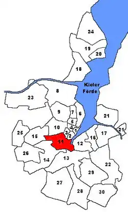 - ↑ a b Stadtplan der Stadt Kiel herausgegeben von der Stadt Kiel mit detaillierten Stadtteilgrenzen.