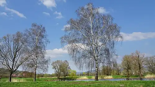 ![]() Der Kiessee wird von einem geschlossenen Ufergehölzsaum eingerahmt, in dem Weiden mit ihren weit ins Wasser ragenden Ästen vorherrschen. | ||