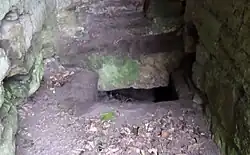 In den größten offenen Kamin des Donjons sind zwei behauene, rote Sandsteinplatten eingesetzt, auf denen gotische Schriftzüge zu erkennen sind. Auf einem steht „Maria“, der andere, kleinere Schriftzug konnte noch nicht entziffert werden. Sandsteinsäulen auf beiden Seiten dieses offenen Kamins tragen Darstellungen von Kletterpflanzen, vermutlich Efeu. Eine Erklärung des gotischen Schriftzuges ist, dass es Namen von Heiligen sind und dass dies ein Apotropaion zur Abwehr böser Geister an einem sonst „ungeschützten“ Eintrittsort in das Haus war.