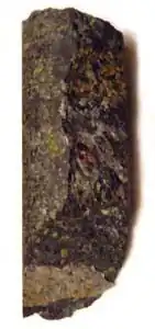 Der Kimberlit ist ein olivin- und phlogopithaltiges, blaugrün bis schwarzes ultramafisches Gestein magmatischen Ursprungs, das akzessorisch Diamanten führen kann. Weitere Bestandteile sind Orthopyroxen, Klinopyroxen, Rutil, Perowskit, pyropreicher Granat und seltener titanhaltiger Andradit und Schorlomit.[1] Die Zusammensetzung von Kimberlit entspricht der seines Ursprungsgebietes, dem Oberen Erdmantel. Die Dichte liegt zwischen 3,3 und 5,7 g/cm³.
