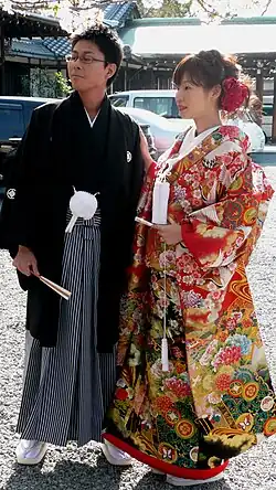 Uchikake: Farbiger Hochzeitskimono der Braut aus schwerem, mit glückbringenden Symbolen durchwirktem und besticktem Seidenbrokat. Die beliebteste Grundfarbe des Uchikake ist Rot; es kommen aber auch Schwarz oder andere Farben vor. Die Verzierungen sind zu einem großen Teil gold- und silberfarben. Die Ärmelschleppen hängen bis zu den Fußknöcheln herab. Der Uchikake ist um ca. 30–40 cm länger als die anderen Kimonos, so dass der untere Saum über den Boden schleift. Zum Uchikake trägt die Braut keine Kopfbedeckung, sondern lediglich prachtvollen Kopfschmuck. Ohne Hilfe kann die Braut den Uchikake weder korrekt anziehen noch sich damit angemessen fortbewegen. Bis zur Edo-Zeit (1603–1867) war der Uchikake der formelle Kimono von Samurai-Frauen und Adeligen.