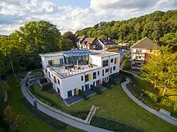 - Das Jugendhospiz kam im Sommer 2017 hinzu. Diese Erweiterung war notwendig geworden, weil Jugendliche andere Bedürfnisse haben als Kinder.[26] Die beiden Einrichtungen sind nicht nur durch die unmittelbare örtliche Nähe der zwei Gebäude,[27] sondern auch organisatorisch als Kinder- und Jugendhospiz Regenbogenland miteinander verbunden.