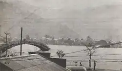 Burg, Residenz (R) und Samurai-Viertel sind auf einer überlieferten Karte von um 1650 gut erkennbar, ebenso das breite Flussbett im Süden mit einer der zahlreichen Vorgängerbrücken, die bei Hochwasser immer wieder weggerissen wurden. Das Lehen (han) Iwakuni wuchs schnell und bald fehlte Platz in der Vasallenresidenz unterhalb des Berges, neue Häuser mussten auf der gegenüberliegenden Flussseite gebaut werden. Die Versammlungen auf der Residenz-Seite waren dann aber nur schwer für alle Vasallen zu erreichen, deshalb wurde 1673 vom damaligen Fürsten Kikkawa Hiroyoshi entschieden, eine neue, auch bei Hochwasser passierbare Bogenbrücke zu bauen. Inspiriert wurde er dabei vom chinesischen Mönch Dokuryū Shōeki (独立性易), von dem er erfuhr, dass es in Hangzhou eine sogenannte Brokatschärpen-Brücke gibt, die mit sechs Steinfundamenten im Wasser und darüber Brückenbögen in Holzbauweise errichtet worden war. Die nach diesem Vorbild so in Iwakuni gebaute Brücke musste allerdings in ihrer Konstruktion nochmals überarbeitet werden, da gleich im ersten Jahr nach der Errichtung Teile der Brücke durch das Hochwasser 1674 zerstört wurden. Die verbesserte Brücke stellte sich als durchaus ausgereift und standhaft heraus. Sie hielt 276 Jahre, bis sie durch den Taifun Kezia (japanisch: Kiji(y)a) im September 1950 in die Fluten des Flusses gerissen wurde:[1]