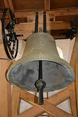 Im Jahr 1957 wurden bei der Glockengießerei Otto Schilling und Gottfried Lattermann in Morgenröthe-Rautenkranz im Vogtland (Firmensitz in Apolda) das neue Geläut aus Stahlhartguss hergestellt.[17] Gleichzeitig entstanden für die Stahlgussglocken neue gekröpfte Glockenjoche, um den Glockenstuhl und das Mauerwerk des Turmes von den auftretenden Schwingungskräften zu entlasten. Die verbliebene mittlere Bronzeglocke wurde 1959 an die Gemeinde Striesen bei Großenhain abgegeben. Die neuen Stahlglocken mit dem Ton g′, b′ und c′, trugen die Namen Friede, Barmherzigkeit und Gnade. Die festliche Weihe des Stahlgussgeläutes fand am 28. September 1958 statt. Im Jahr 1983 wurde ein elektrisches Läutewerk installiert. Bis zum Läuteverbot im Jahr 2005 erklangen die Glocken und läuteten am 1. März zum letzten Mal.[18] Ein Glockensachverständiger hat Verschleißerscheinungen am Glockenstuhl und einen Abriss im Joch, welches die große Glocke trug, festgestellt.