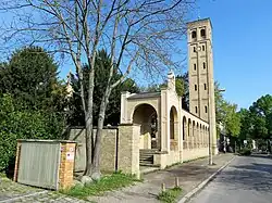 Die Kirche und der diese umgebende Friedhof sind im Osten durch einen Arkadengang von der tiefer gelegenen Ribbeckstraße getrennt. Dem Gang mit neun auf quadratischen Pfeilern stehenden Bögen und offenem Dachstuhl schließen sich im Norden der Campanile und im Süden ein kapellenartiger Baukörper mit kleinem Glockengiebel an, durch den der Zugang über eine vorgelagerte Freitreppe erfolgt. Die Inschrift am Giebel lautet: „GEHET ZU SEINEN THOREN EIN MIT DANKEN, ZU SEINEN VORHOEFEN MIT LOBE.“ Die Brüstung zwischen den Arkadenpfeilern ist aus zierlichen, auf Terrakottasäulen ruhenden Bögen gebildet.