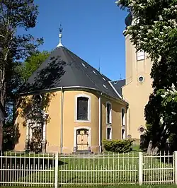 Das Bauwerk ist eine stattliche Saalkirche aus den Jahren 1725–1731 mit einem gerade geschlossenem Chor, dessen Ecken abgerundet sind. Im Jahr 1898 erfolgte eine Erweiterung und völlige Umgestaltung des Inneren durch Theodor Quentin. Dabei wurden das Bauwerk um etwa 10 m nach Westen verlängert, der Turm um 20 m erhöht, eine neue Sakristei an der Ostseite des Altarraums angefügt und ein Treppenturm zu den Emporen an der Nordseite angebaut. Restaurierungen wurden in den Jahren 1958, 1984 (außen) und 1991 durchgeführt.