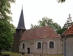Der spätgotische, ziegelgedeckte Backsteinsaal mit dreiseitigem Ostschluss, Strebepfeilern und einem glasierten Sockelprofil entstand wohl im 15. Jahrhundert. Im 16. Jahrhundert wurde der geböschte, verbretterte Westturm mit seinem hohen Spitzhelm angefügt und nach Untersuchungen rund 80 Jahre älter als der vergleichbare Turm (1667 erstmals erwähnt) der Kirche in Japenzin. Der Kirchbau wurde barock überformt und verputzt. Der Turm wurde in den 1990er Jahren erneuert, war früher mit Holzschindeln gedeckt.
