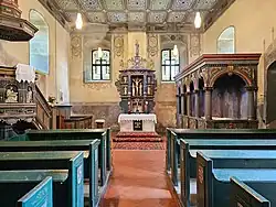 Das Altarretabel wird im Dehio-Handbuch als „aufwendig“ beschrieben. Es entstand im Jahr 1625 und ist mit Bandelwerk verziert. Der Patron ließ 1918 einen figürlichen Schmuck hinzufügen. Bekrönt wird der Aufsatz durch eine Mondsichelmadonna aus dem Anfang des 16. Jahrhunderts. Zur weiteren Kirchenausstattung gehören ein Kanzelkorb aus der ersten Hälfte des 17. Jahrhunderts, der mit den Bildern der Evangelisten in den Korbwangen verziert ist. An der Rückwand ist Jesus Christus zu sehen. Neben der Kanzel steht an der Nordwand ein Epitaph, das an den Kirchenpatron und seine Ehefrau erinnert. Nach dem Brand 1918 kam vermutlich ein Logenprospekt mit Rundarkaden in das Bauwerk. Die Ausmalung zeigt unter anderem den Heiligen Geist, symbolisiert durch eine Taube mit Strahlenkranz. Als weiteren Bestandteil der Ausmalung befindet sich auf der Nordwand eine Tafel, die an die Gefallenen aus den Befreiungskriegen und dem Ersten Weltkrieg erinnert.[1] Auf der Empore steht eine Orgel, die die Orgelbauer Schlag & Söhne 1919 errichteten. Das Werk mit pneumatischen Membranenladen besitzt 8 Register auf zwei Manualen und Pedal.[2][3]