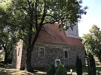 Die Dorfstraße führt von Norden kommend auf den historischen Dorfanger zu. An der nordwestlichen Ecke zweigt sie nach Westen ab, verläuft aber auch in südlicher Richtung am Dorfanger vorbei. Dort steht mittig die Kirche auf einem leicht erhöhten Grundstück mit einem Kirchfriedhof, der mit einer Mauer aus unbehauenen und nicht lagig geschichteten Feldsteinen eingefriedet ist.