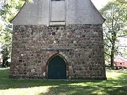 Das Bauwerk entstand im Wesentlichen aus Feldsteinen, die lagig geschichtet und vergleichsweise sorgfältig behauen wurden. Der Chor ist gerade und nicht eingezogen. An der Ostwand sind zwei gedrückt-segmentbogenförmige Fenster, deren Fasche durch einen hellen, rechteckig angeordneten Putz betont werden. Mittig sind die Reste eines schmalen Spitzbogenfensters erkennbar. Ausbesserungsarbeiten an den beiden vorhandenen Fenstern zeigen, dass sich an der Ostwand ursprünglich eine Dreifenstergruppe befand. Im ebenfalls aus Feldsteinen errichteten Giebel sind drei spitzbogenförmige, hell angestrichene Blenden.
