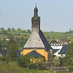Die Kirche liegt im Zentrum des Ortes auf dem westlichen Ende eines kleinen Höhenrückens, der den Ort von Ost nach West quert. Der heute genutzte Friedhof mit dem Grab von Karl Stülpner befindet sich am östlichen Ende dieses Rückens in etwa 250 m Entfernung. Dieser besteht seit dem 16. Jahrhundert, wurde jedoch anfangs nur selten genutzt. Seit 1867 erfolgen keine Beerdigungen mehr auf dem Gelände um die Kirche. Auf dem Kirchengelände befinden sich ein Denkmal für die Gefallenen des Ersten Weltkrieges und die Reste eines Denkmals für die Opfer des Deutsch-Französischen Krieges.