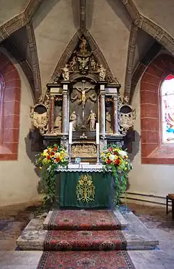 Ein spitzbogiger Triumphbogen trennt den Chor vom Kirchenschiff. An der Nordseite gibt es eine Sakramentsnische sowie ein altes Weihekreuz. Zwei weitere Kreuze befinden sich an der Wand hinter dem Altar.