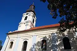 Das einschiffige Kirchengebäude mit einem rechteckigen Grundriss ist in seiner Grundkonzeption, im Stil des Barock erbaut worden, mit einer erweiternden von Außen fünfseitigen und im Inneren halbrunden Altar-Apsis im Osten und einem Narthex mitsamt einem aus der Westfassade sich erhebenden hohen barocken Kirchturm, den eine mehrgeschoßige Zwiebelturmkappe krönt, im Westen. Auf die Ostseite der Kirchturmhaube wurden die Jahreszahlen 1780 und 2008 verewigt.