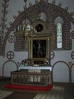 Reste einer gotischen figürlichen Malerei, die Ende des 14. Jahrhunderts entstand, sind in den Laibungen des Triumphbogens zu sehen. Die östlichen Fenster sind mit Bleiglas versehen.