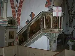 Die barocke Kanzel stammt aus dem Jahr 1702, der etwa fünf Meter hohe Altaraufsatz von 1703. Beide wurden in der gleichen Werkstatt gefertigt. Der Altaraufsatz wurde im Jahr 2007 in der Farbfassung von 1938 restauriert. 2017 wurde die Goldrahmung der Kanzel erneuert.