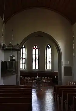 Im Innern sind das Kirchenschiff und der etwas erhöhte Chor durch einen Rundbogen voneinander getrennt. Auf der linken Seite des Bogens ist die hölzerne, polygonale Kanzel angebracht. Über dem Schiff wölbt sich eine Holztonnendecke. An der Rückwand ruht auf zwei profilierten Holzpfosten eine Empore mit der Orgel. Der Chor ist polygonal geschlossen und verjüngt sich nach hinten. Hier finden sich Glasfenster des Aargauer Künstlers Felix Hoffmann.