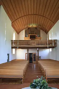 Um 1896 verfügte die Kirche über eine zweistöckige Empore, wobei sich der erste Stock auch über die rechten Kirchenschiffseite bis fast zum Chor hinzog.[2] Im Jahre 1896 wurde durch Orgelbau Goll & Cie, Luzern eine Orgel mit 8 klingenden Registern auf dem zweiten Geschoss der Empore eingebaut. Diese wurde im Jahre 1957 ersetzt durch eine grössere Orgel mit 18 klingenden Registern von Orgelbau Metzler AG, Dietikon.[2] Diese neue Orgel steht auf dem ersten Geschoss der Empore, während das zweite wohl im Zuge des Orgelersatzes abgebaut wurde, genauso wie auch die Durchgehend ein auf alten Photographien sichtbares Dachfenster schlossen wurde.
